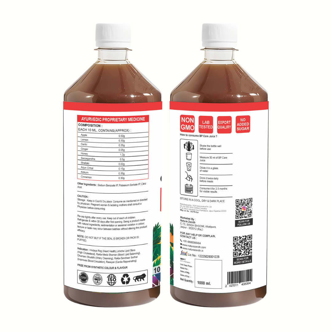 Natre Zenith BP Care Juice is a premium Ayurvedic herbal blood pressure support juice designed to help maintain healthy BP levels naturally. This powerful formulation combines the goodness of traditional herbs like Arjun Chhal, Sarpagandha, Shallaki, Kokum, and Cinnamon, known in Ayurveda for supporting cardiovascular health and circulation.